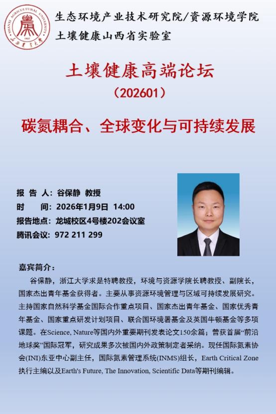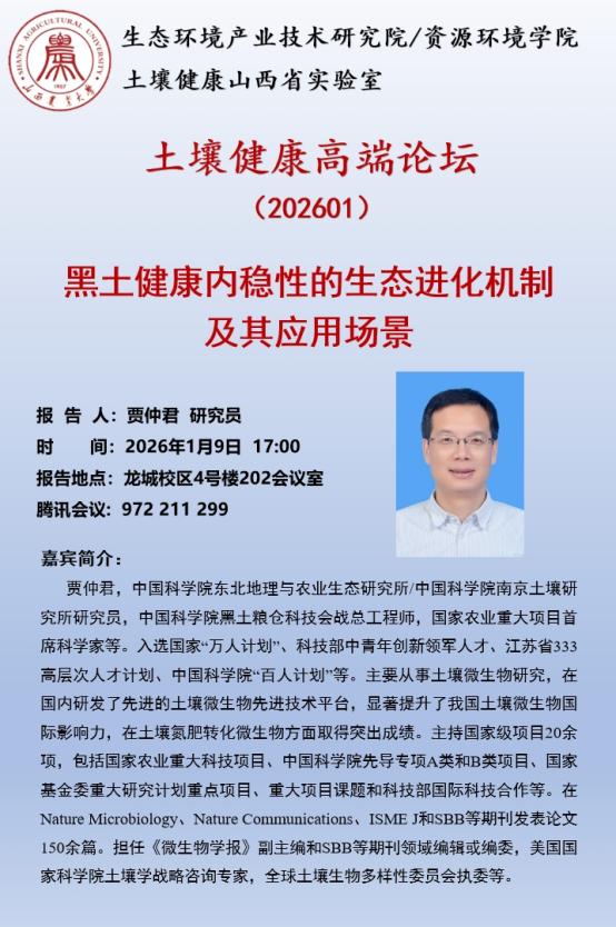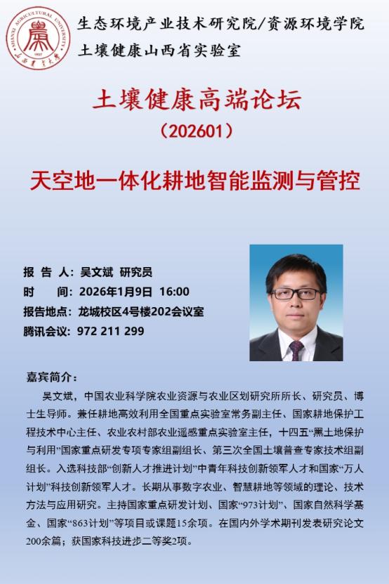应土壤健康山西省实验室邀请,浙江大学谷保静教授、中国科学院南京土壤研究所褚海燕研究员、中国农业科学院吴文斌研究员、中国科学院东北地理与农业生态研究所/南京土壤研究所贾仲君研究员将于2026年1月9日分别做题为《碳氮耦合、全球变化与可持续发展》《功能合成菌群与土壤健康培育》《天空地一体化耕地智能监测与管控》《黑土健康内稳性的生态进化机制及其应用场景》的学术报告(龙城校区4号楼202会议室),同步腾讯会议号:972 211 299。